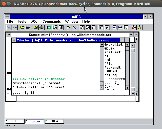 20:28, 26 June 2016 Dosbox win311 mirc16.gif (file) 23 KB Naszvadi DOSBox win3.11 mIRC16 session with networking 1